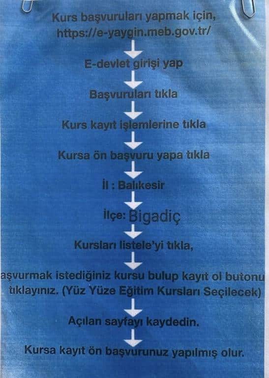 Bigadiç Muzaffer Emiroğlu Halk Eğitimi Merkezinde açılan ve halen kayıt olunabilecek durumda olan kurslara kayıt yaptırmak için e-yaygın.meb.gov.tr adresine e-devlet şifreniz ile giriş yaparak ''Başvurular'' sekmesi altındaki ''Kursa Ön Başvuru Yap'' sekmesini tıklayarak İl ''Balıkesir'' ve İlçe ''Bigadiç'' seçip kursları listele sekmesini tıklayarak kayıt olmak istediğiniz kursu bulup sağ taraftaki mavi kursa kayıt ol sekmesi ile kayıt yapabilirsiniz. Ekteki tablodaki adımları izleyerek kayıt olabilirsiniz.